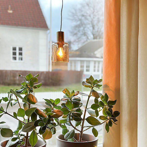 Cylinder vinduspendel i matt messing med glasspendel i fargen amber. Lampens hovedmateriale er metall/glass. Lyset tennes og slukkes med bryter på ledning. Ledning 4 meter. Maks wattstyrke 30 W. Lampe monteres med brakett på ledning og strømtilkobling med støpsel.