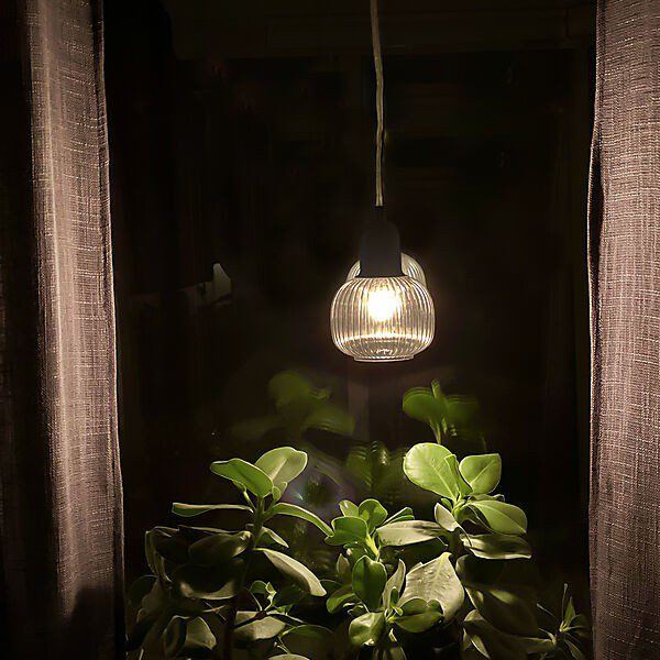 Elin vinduspendel har et stilrent design i metall med en dekorativt rillet glasskjerm som sprer et mildt og behagelig lys. Øk stemningen i rommet ved å henge en eller flere for å lyse opp plantene i vinduskarmen. Eller hvorfor ikke henge den ved sengen eller sofakroken? Kombiner gjerne med våre andre lamper i Elin-familien.
